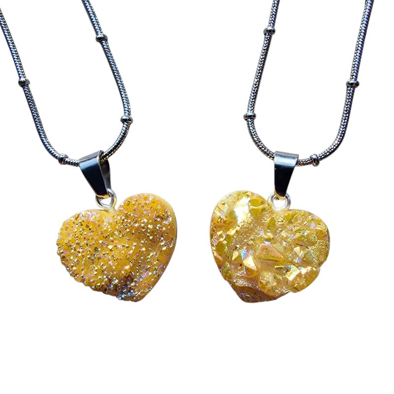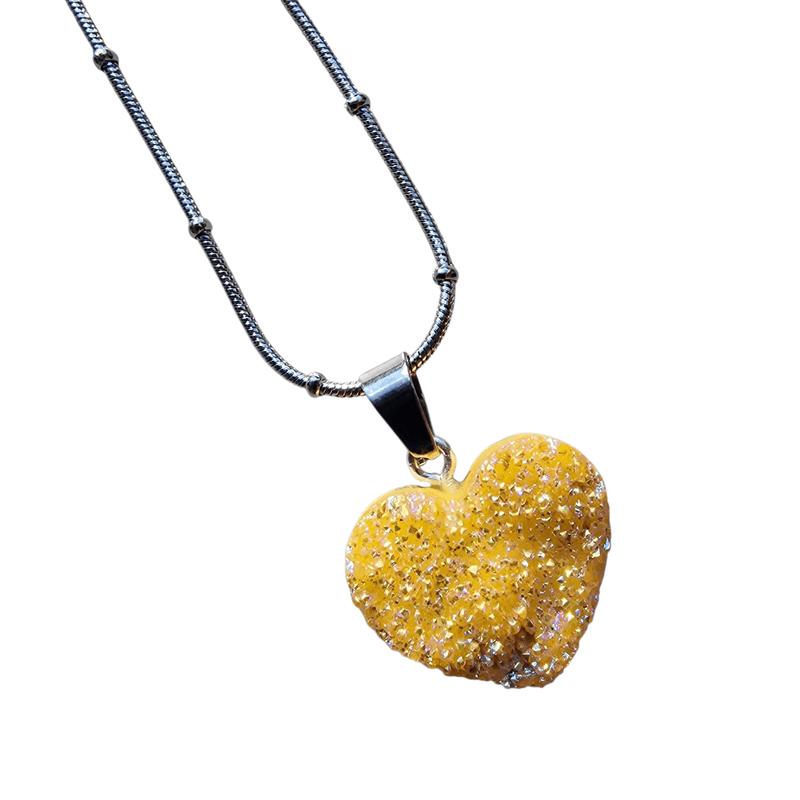 Tűnj ki a tömegből ezzel az egyedi, szív formájú achát drúza nyaklánccal, melynek élénk, színjátszó sárga árnyalata minden tekintetet magára vonz! A színezett drúza achát medál természetes kristályfelülete csillogóan tükrözi a fényt, így minden darab különleges és megismételhetetlen.