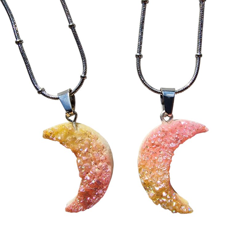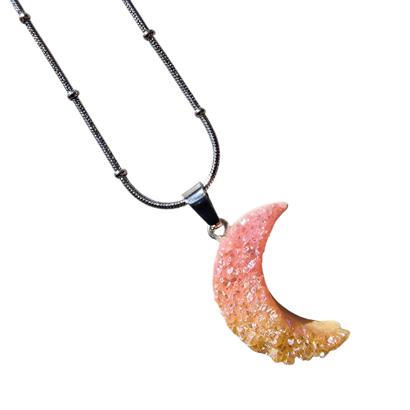 Hold alakú achát drúza ásvány nyaklánc – színezett kristály medál, nemesacél láncon (45 cm)