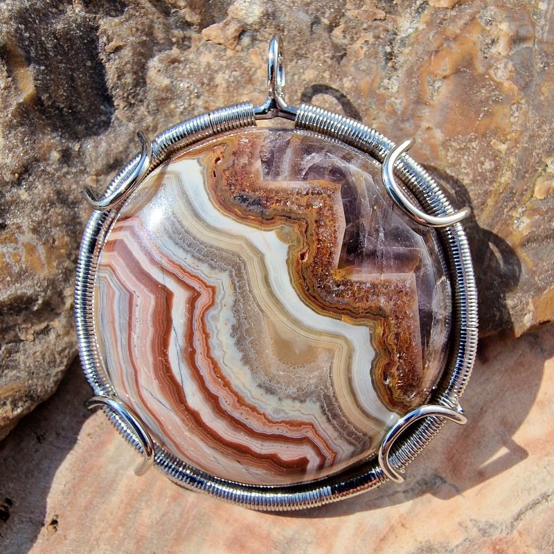 Ez az achát drúza ásvány medál a természet egyik leglátványosabb alkotása. A finoman rétegzett, hullámzó minták és a kristályos rész találkozása különleges, szinte festményszerű megjelenést ad neki.