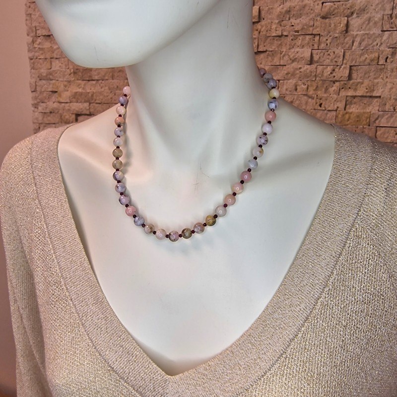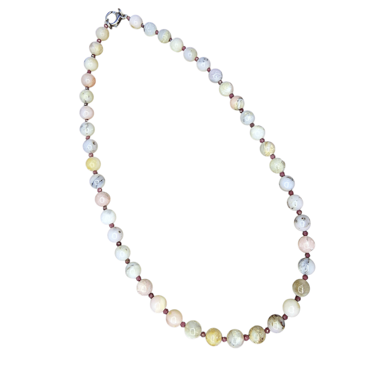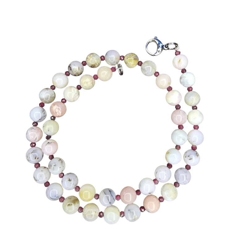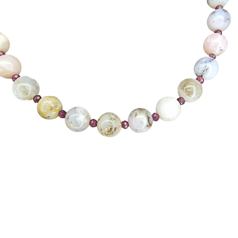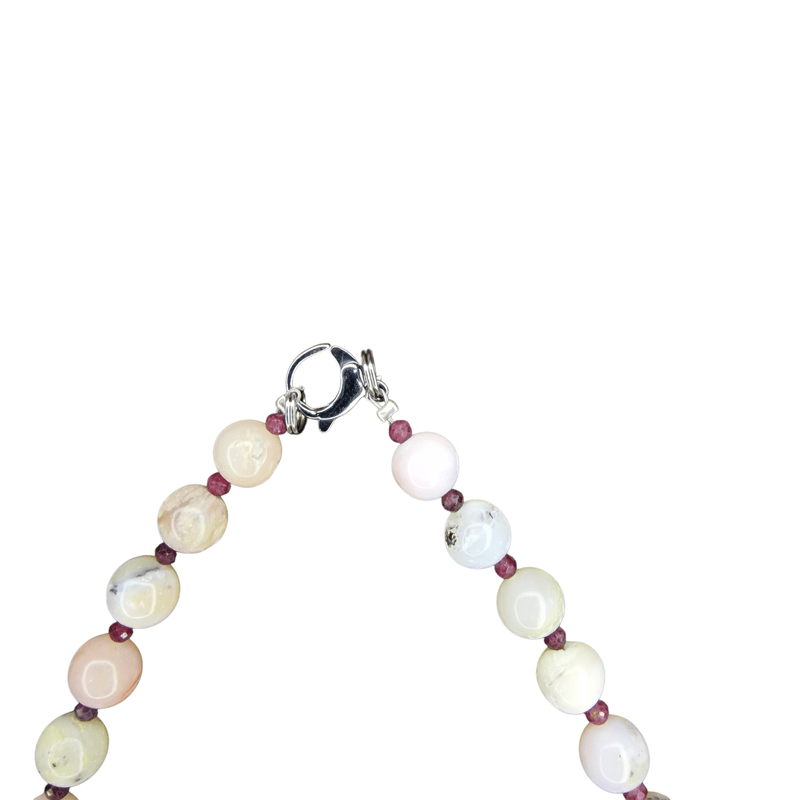 Légy részese a természet színeinek ezzel a mesés, kézzel készült andok opál és rubin nyaklánccal! A világos pasztell színekben játszó opál gyöngyök gyengéd női energiákat sugároznak, míg a finom rubin szemek erőt, szenvedélyt és védelmet hoznak viselőjük életébe.
