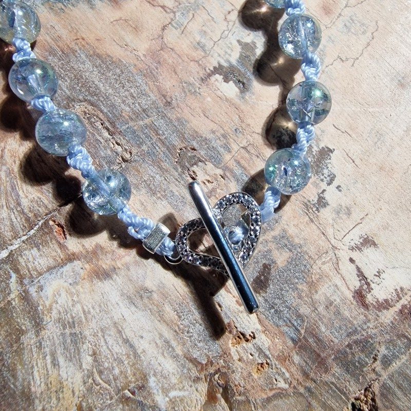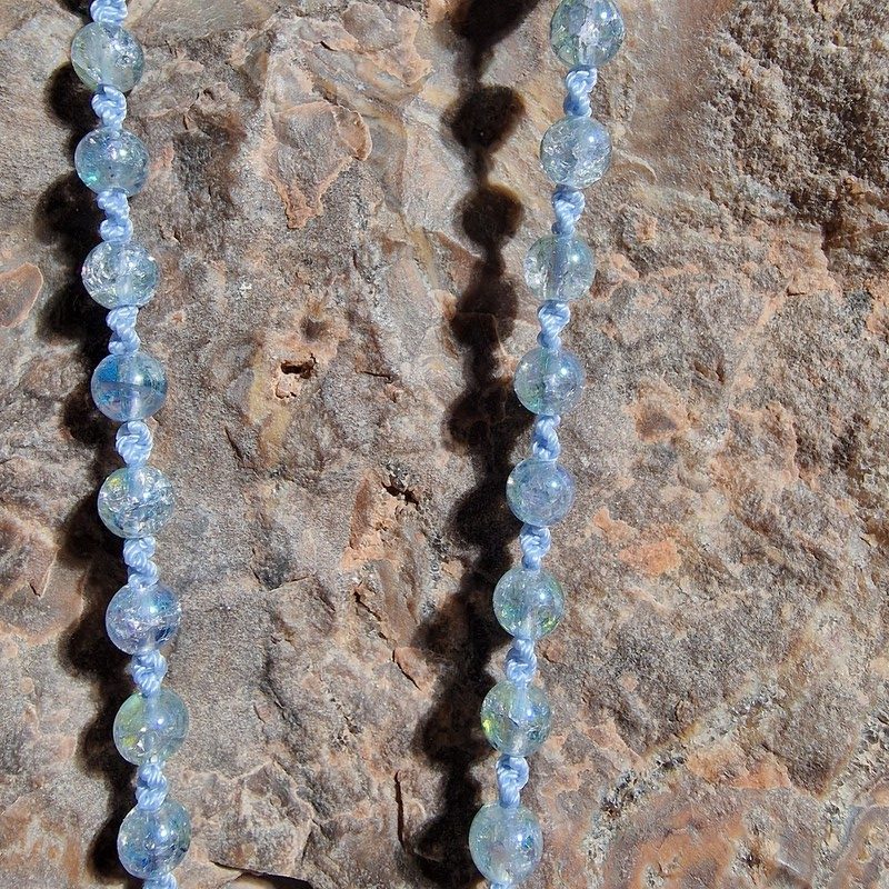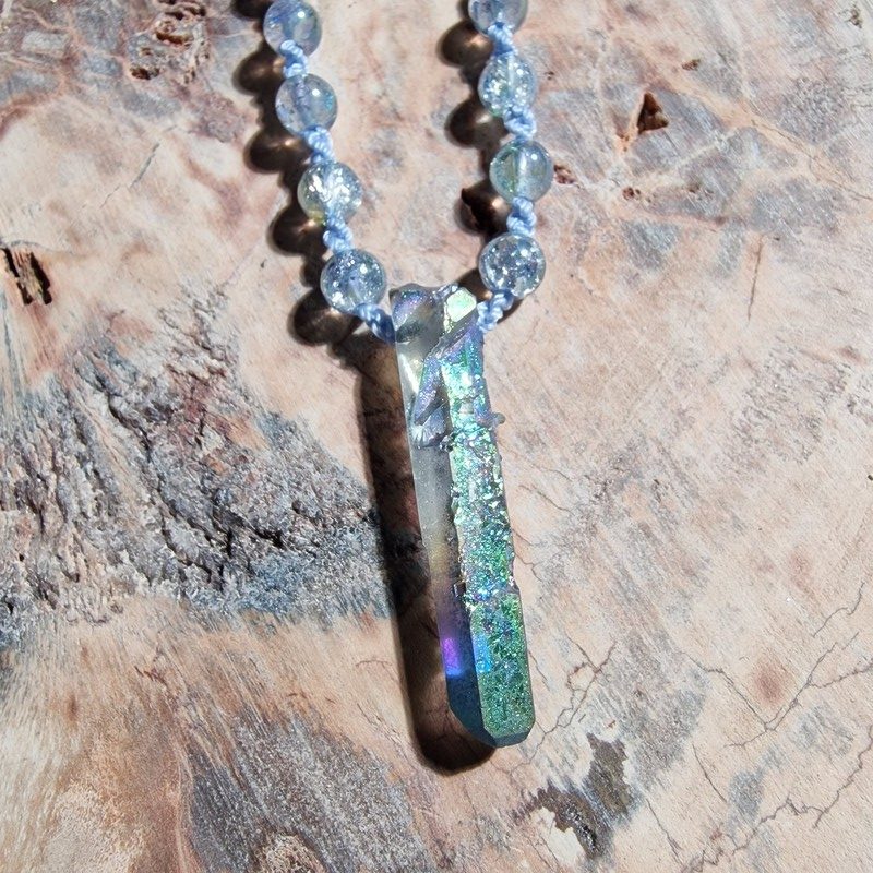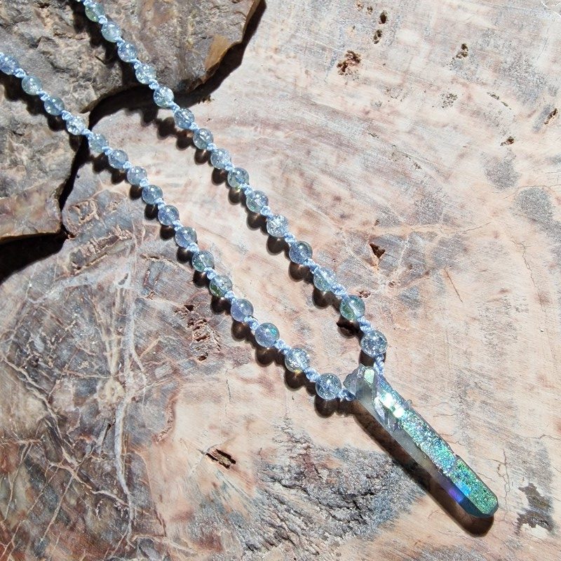 Szürkéskék aura kvarc ásványból készített nyaklánc. 6 mm-es golyóméretekkel.Hegyikristály medállal.