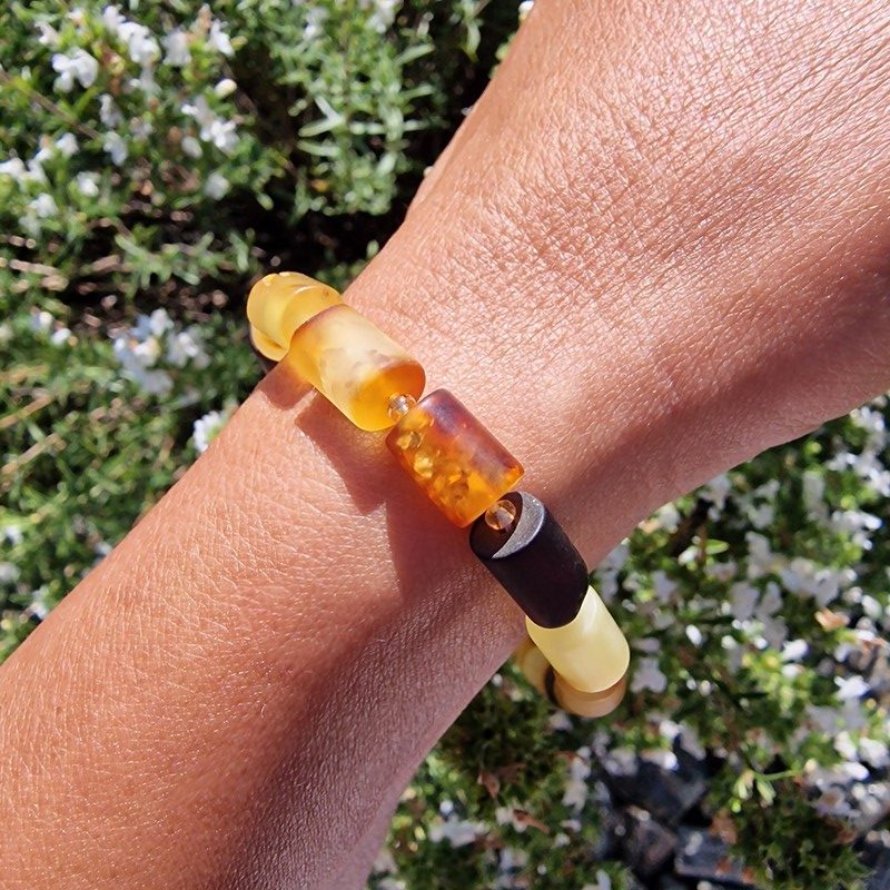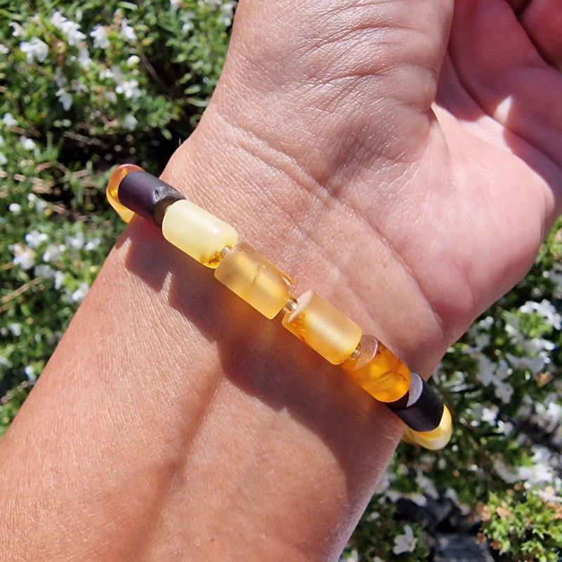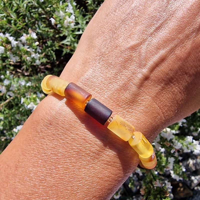 Borostyán karkötő, mattított hosszúkás hengerekből, akár férfiaknak is.