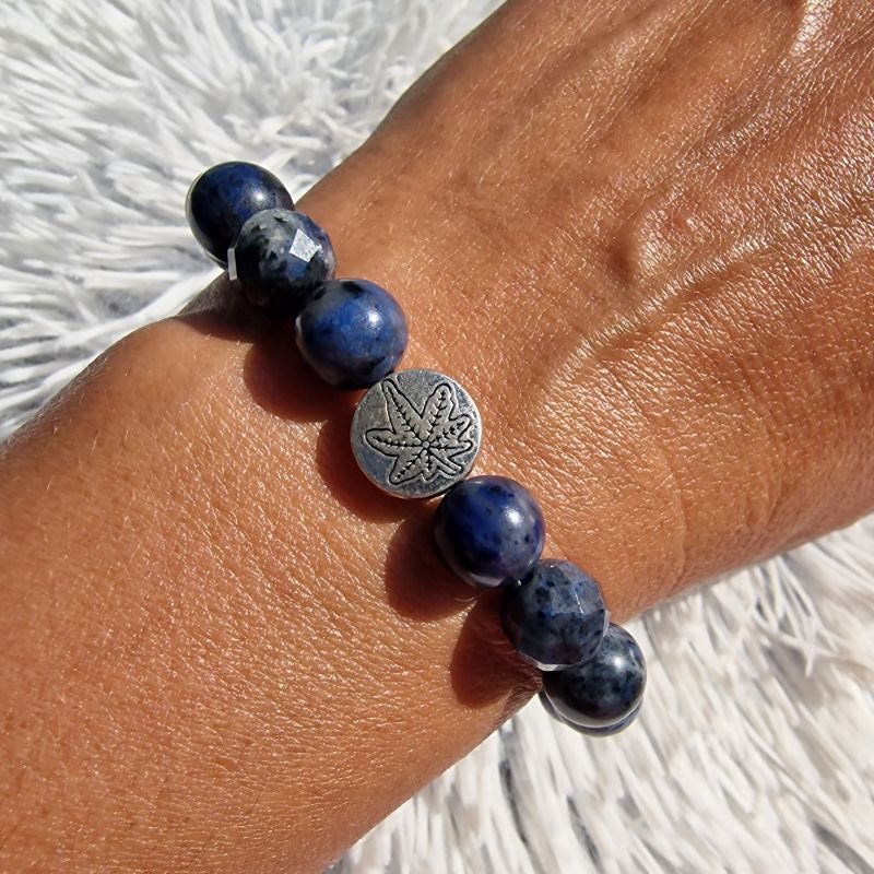 A karkötő közepén egy díszes levél motívumos köztes található, amely természetközeli, egyedi megjelenést kölcsönöz az ékszernek. A mély kék, indigó és szürkés mintázatú dumortierit minden darabot különlegessé tesz.