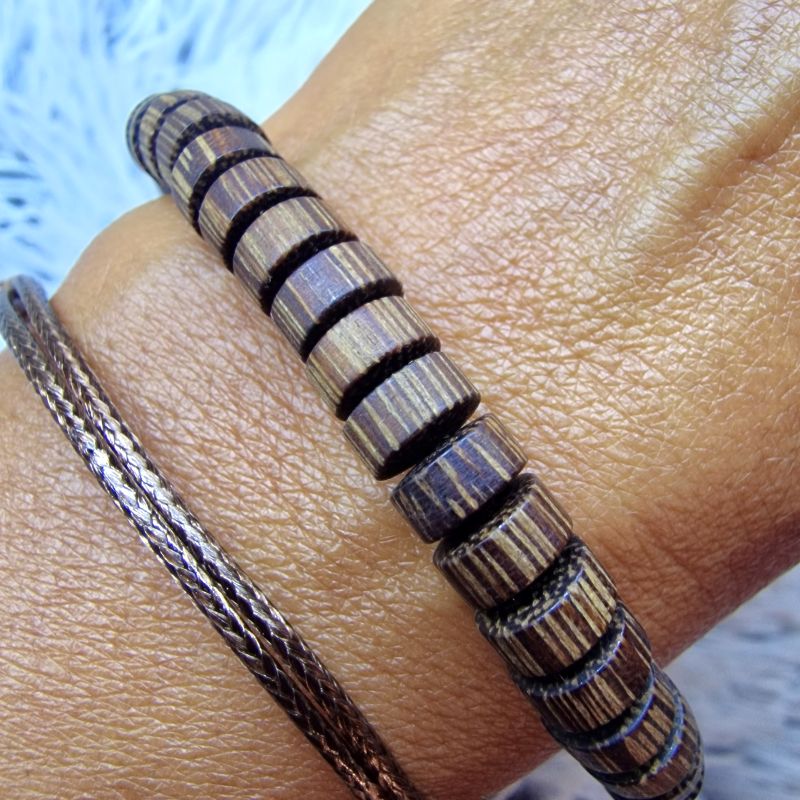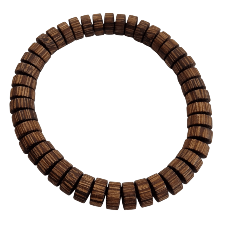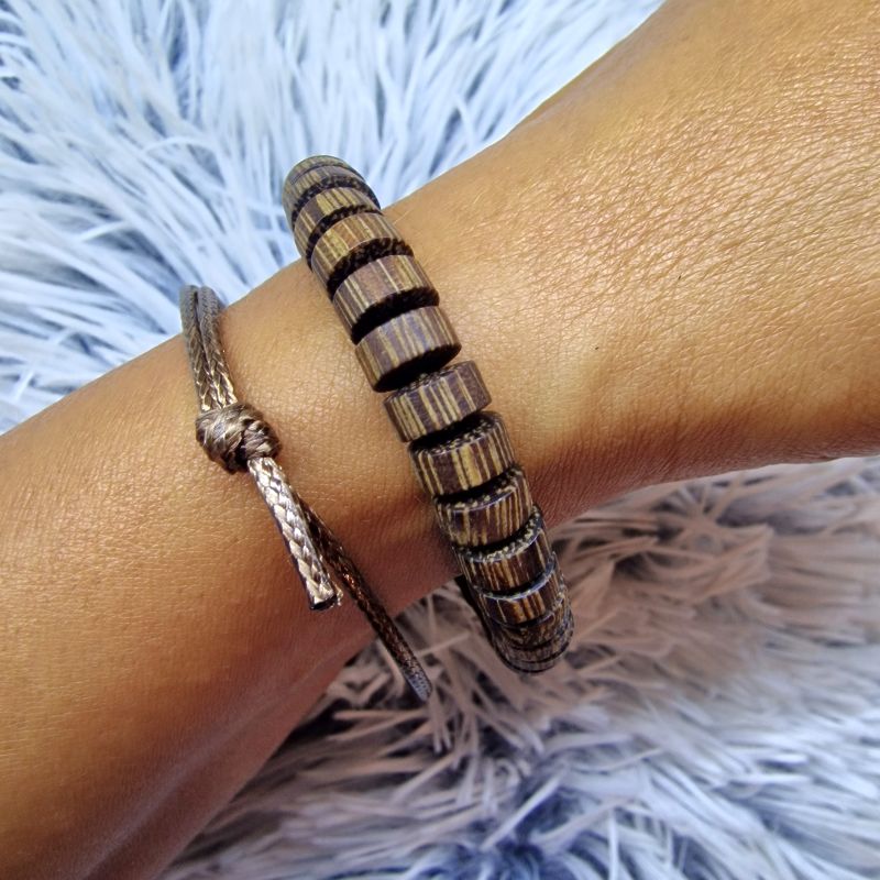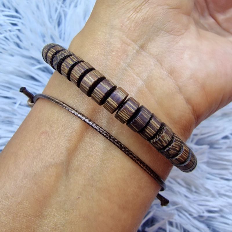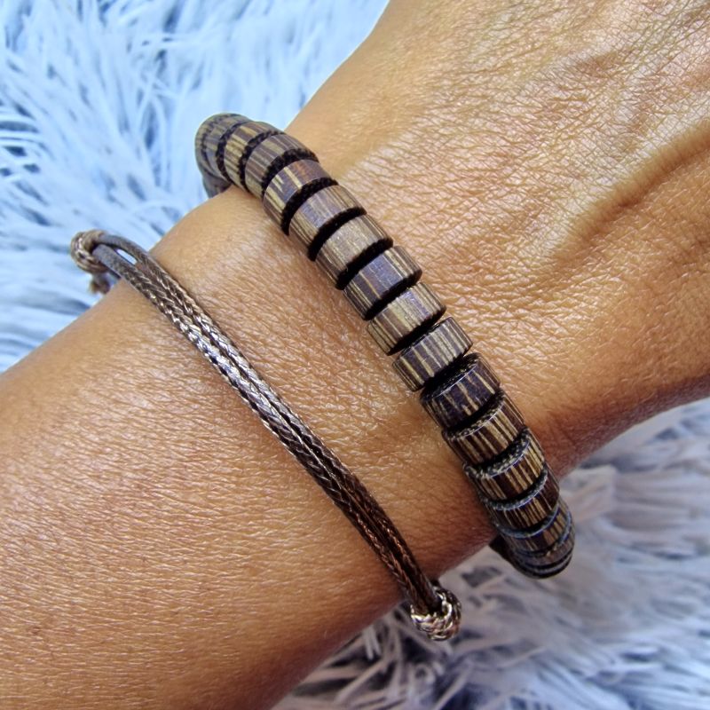 Ez az egyedi megjelenésű fa karkötő sötétbarna, természetes erezetű 8 mm-es henger alakból áll, melyek különleges, strukturált hatást keltenek. Duplasoros ékszerhuzalra fűzve, amely extra tartást és időtállóságot biztosít az ékszernek. A letisztult dizájnt a geometrikus forma és a szabályos elrendezés erősíti, amely bármilyen stílushoz jól illeszkedik – legyen szó hétköznapi vagy elegáns megjelenésről.