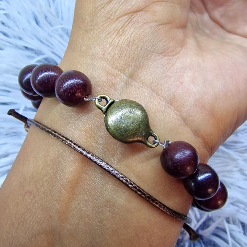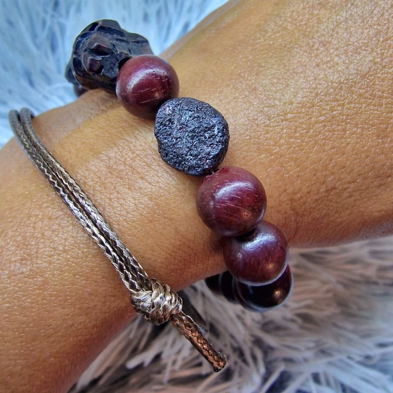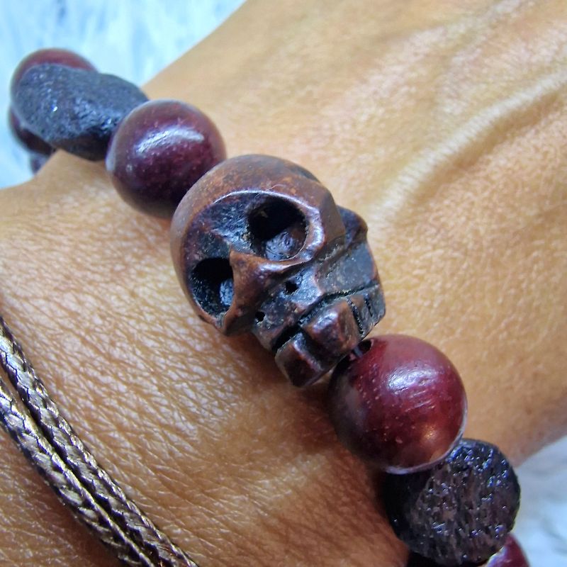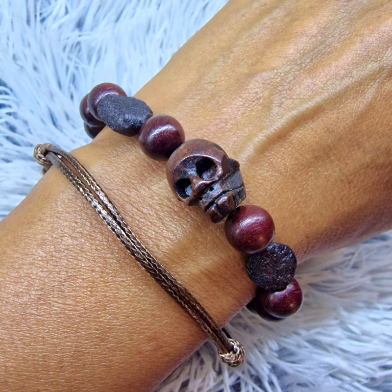 Ez a különleges, vagány megjelenésű fa karkötő sötétbordó, fényes felületű 10 mm-es fa gyöngyökből áll, amelyeket nyers, lapos gránát ásvány és egy kézzel faragott fa koponya dísz egészít ki. A karkötő egyedisége nemcsak a formák és textúrák kontrasztjában rejlik, hanem abban az üzenetben is, amit közvetít: szabadság, erő, és egyediség.