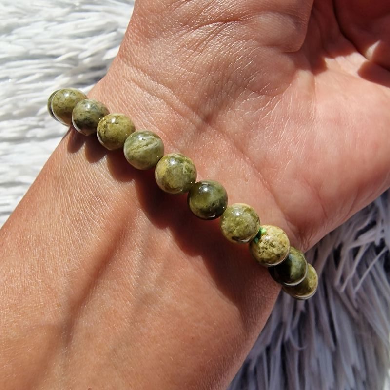 A grosszulár ásvány karkötő elegáns és természetes megjelenésű ékszer, amely a földszínek különleges harmóniáját viseli magán. A 6 mm-es ásványgyöngyök zöldes, sárgás és barnás árnyalatai minden darabot egyedivé tesznek, így nincs két teljesen egyforma karkötő.