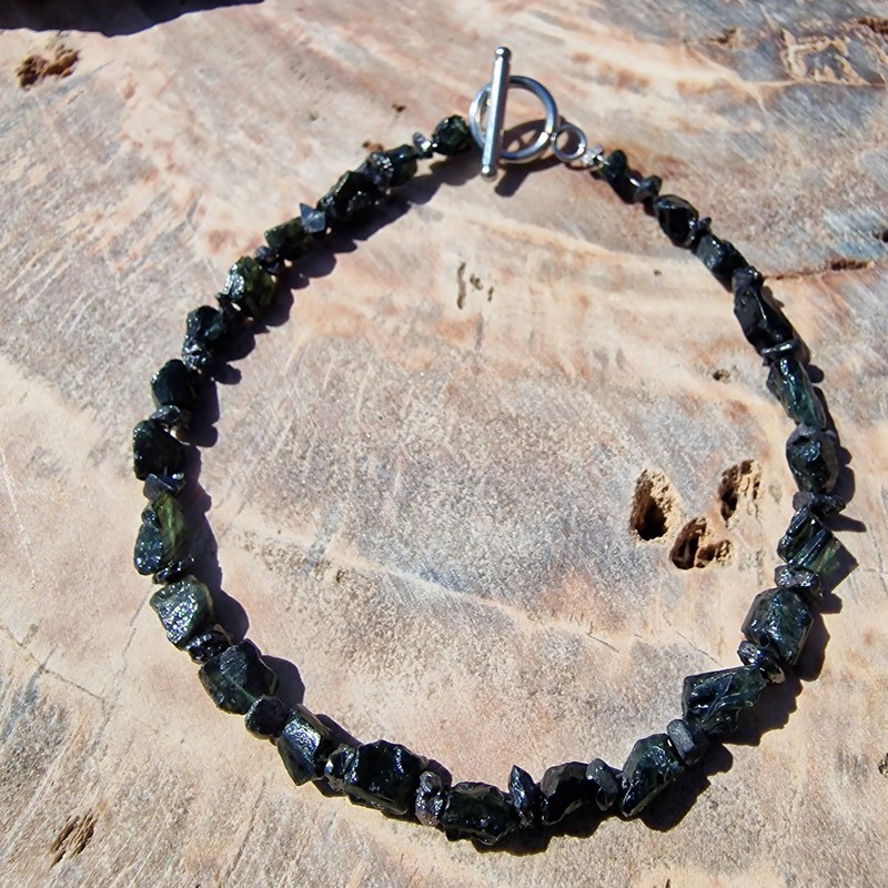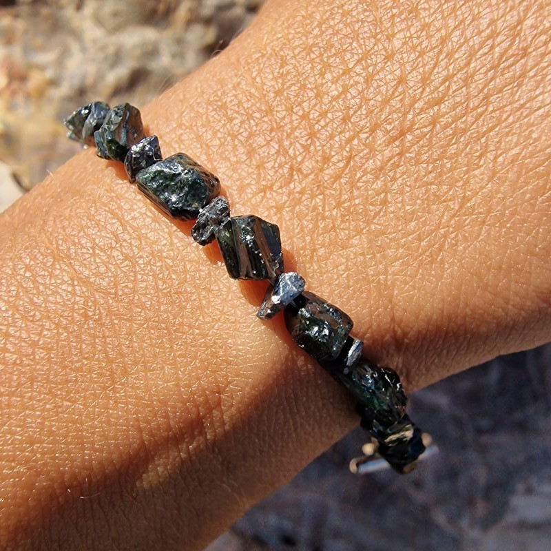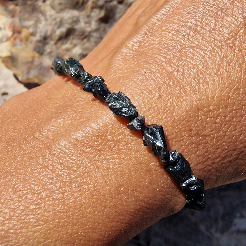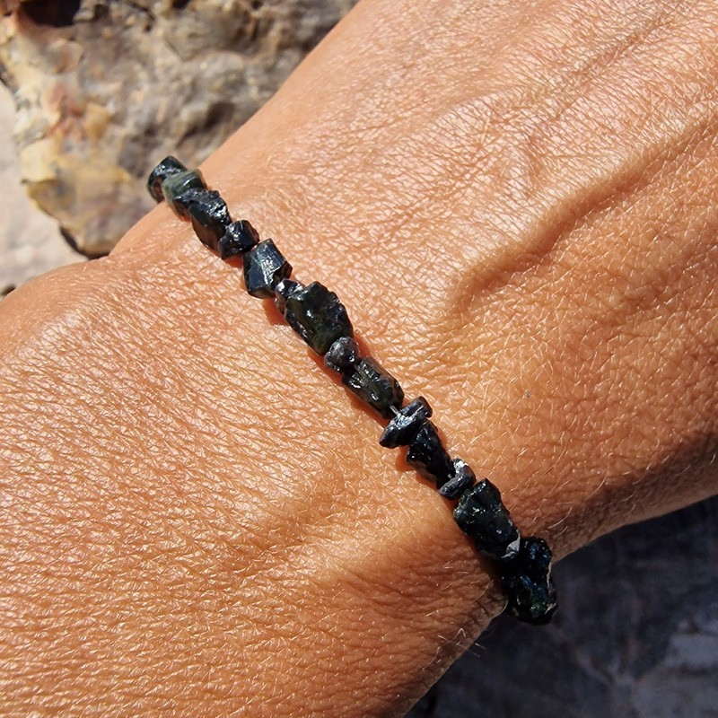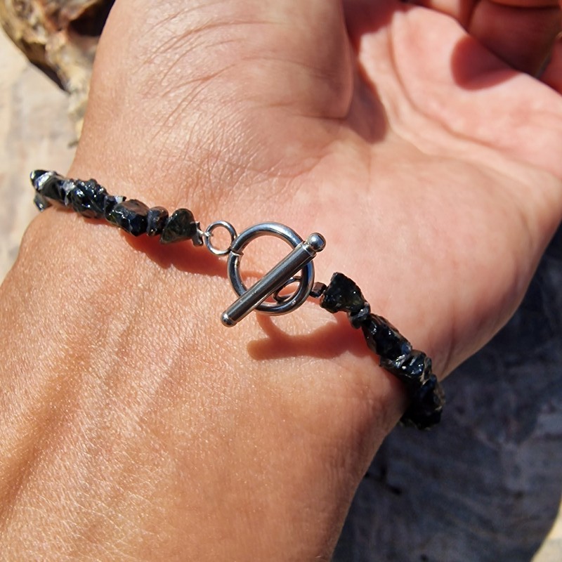 Nyers fekete gyémánt ásvány/drágakő karkötő, tektittel, valódi meteorit szemekkel.