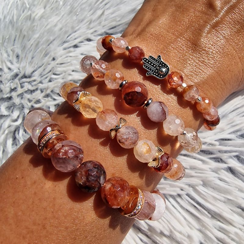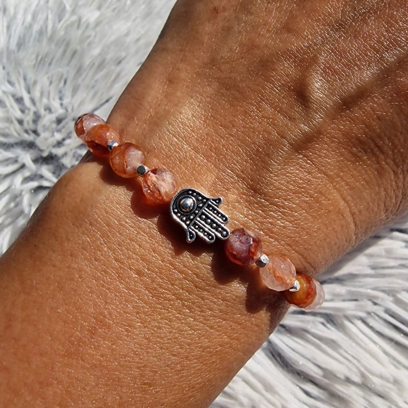 A hematoid kvarc (más néven tűzkvarc) hematit zárványokat tartalmaz, melyek különleges, lángszerű rajzolatot adnak a gyöngyöknek. A 6 mm-es gyöngyméret finom, nőies megjelenést biztosít, így a karkötő önmagában viselve és más ásvány karkötőkkel kombinálva is tökéletes választás.