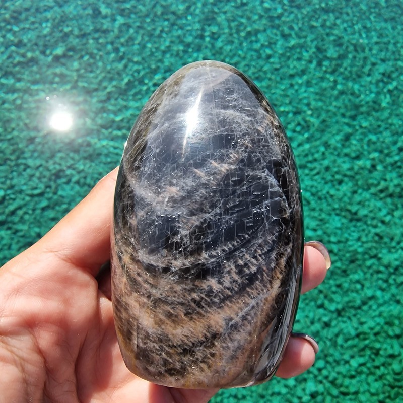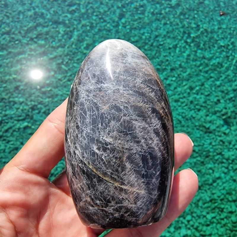 Fekete holdkő ásvány freeform, Madagaszkárról. Megtekinthető videón Instagram oldalunkon.
