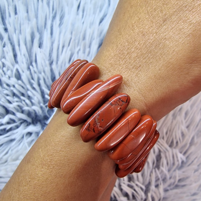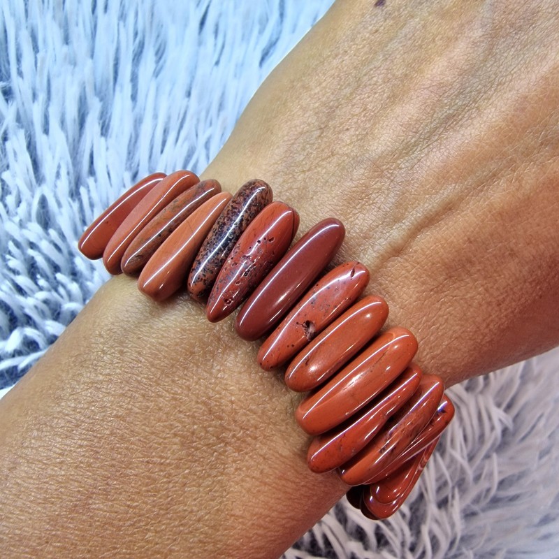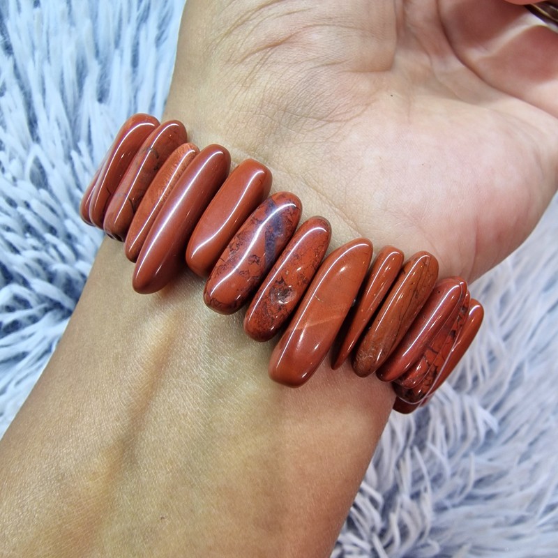 Vörös jáspis ásvány karkötő, hosszúkás szemekből.