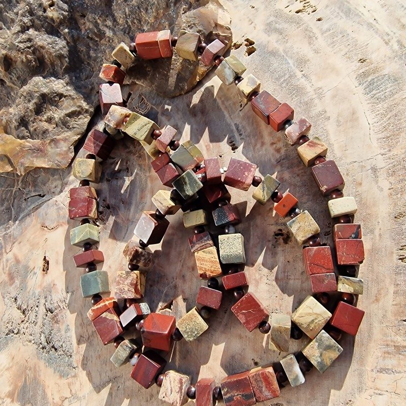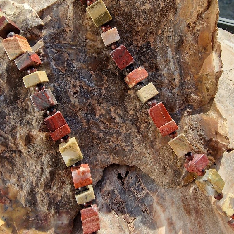 Hosszú, nagyon egyedi jáspis ásványból készített nyaklánc. Szögletes, különböző méretű szemekből.