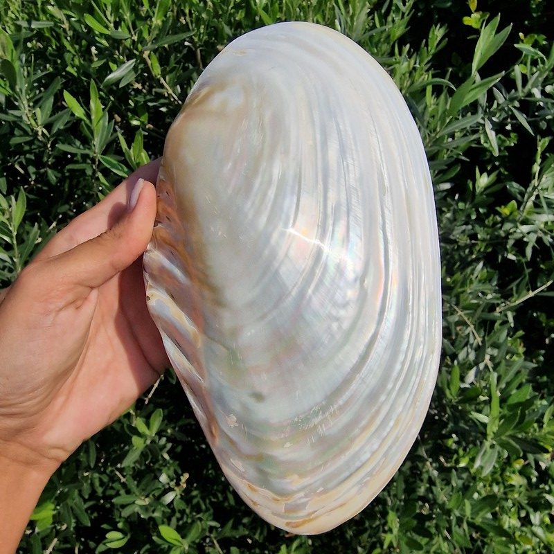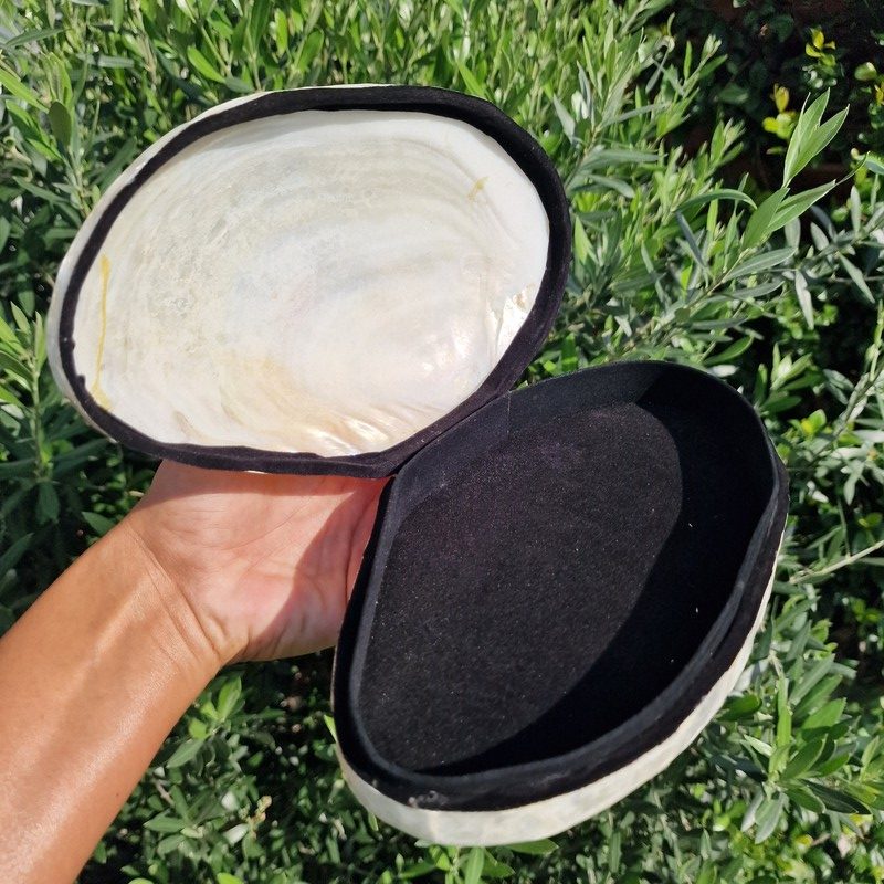 Fedezd fel ezt a különleges, Indonéziából származó kagylóhéj ékszertartót, amely nemcsak praktikus, hanem lenyűgöző dísztárgy is egyben! A természetes gyöngyházfényű kagylóhéjból készült doboz külső felülete irizáló színeivel vonzza a tekintetet, míg a belseje fekete bársonnyal bélelt, így tökéletes védelmet nyújt ékszereid számára.