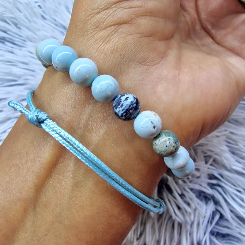 Mindezt most egy ajándék színben harmonizáló, világoskék, állítható zsineg karkötővel egészítjük ki, amely tökéletesen kiegészíti az ásvány karkötő természetes szépségét.