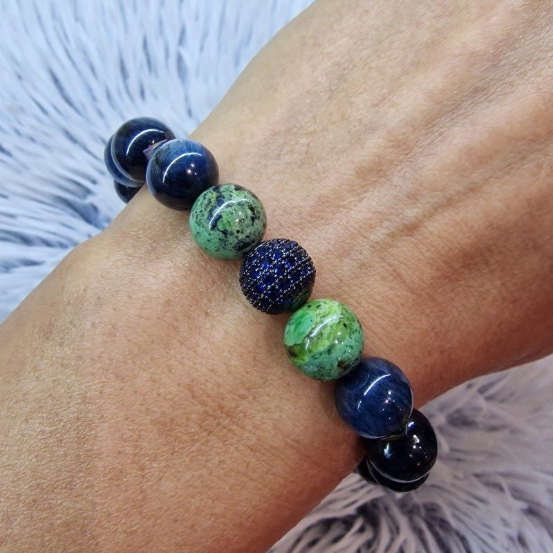 Elegancia és egyediség találkozása természetes ásványokkal! Ez a különleges karkötő prémium minőségű, 10 mm-es kianit gyöngyökből készült, melyeket két oldalról élénkzöld variszcit díszít, középen pedig egy lenyűgöző, sötétkék strasszkő teszi igazán exkluzívvá.