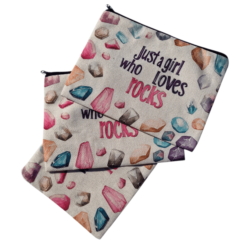 Ez a ásvány mintás kozmetikai táska tökéletes választás minden ásvány- és kristályrajongó számára. A vidám, színes ásvány motívumokkal díszített design és a felirat – „Just a girl who loves rocks” – igazán különlegessé teszi ezt a praktikus kiegészítőt.