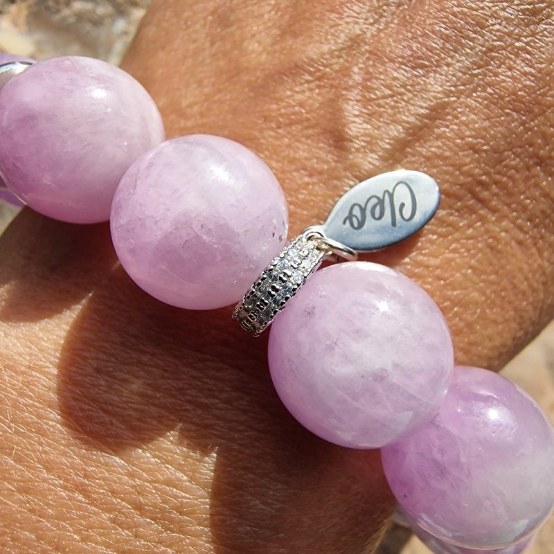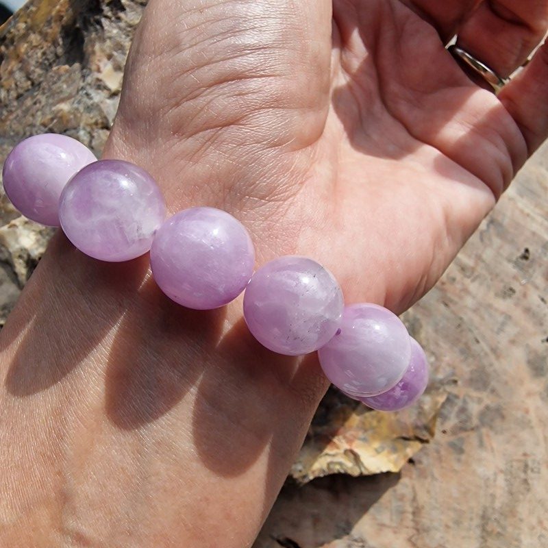 Kunzit ásványból készített karkötő, 15 mm-es golyóméretekkel.