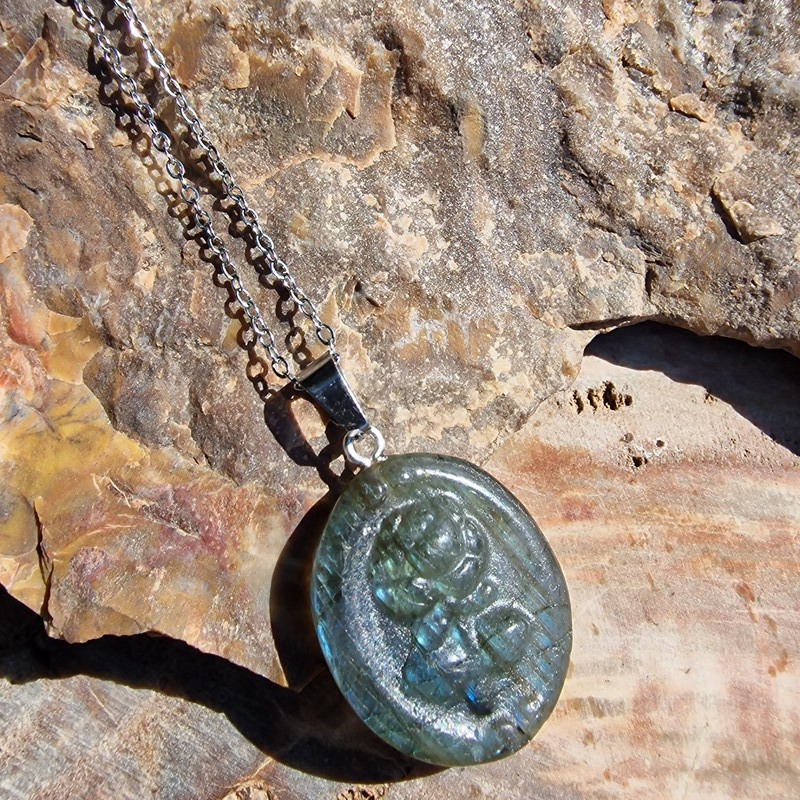 Ez a különleges nyaklánc finoman megmunkált labradorit rózsa medállal készült, amelyet elegáns és tartós nemesacél lánc egészít ki. A labradorit a védelem és a belső harmónia kristálya, amely erősíti az intuíciót és segít megtalálni a belső egyensúlyt. A rózsa a szépség, a szeretet és a tiszta érzelmek szimbóluma, így a medál különleges jelentést hordoz viselője számára.