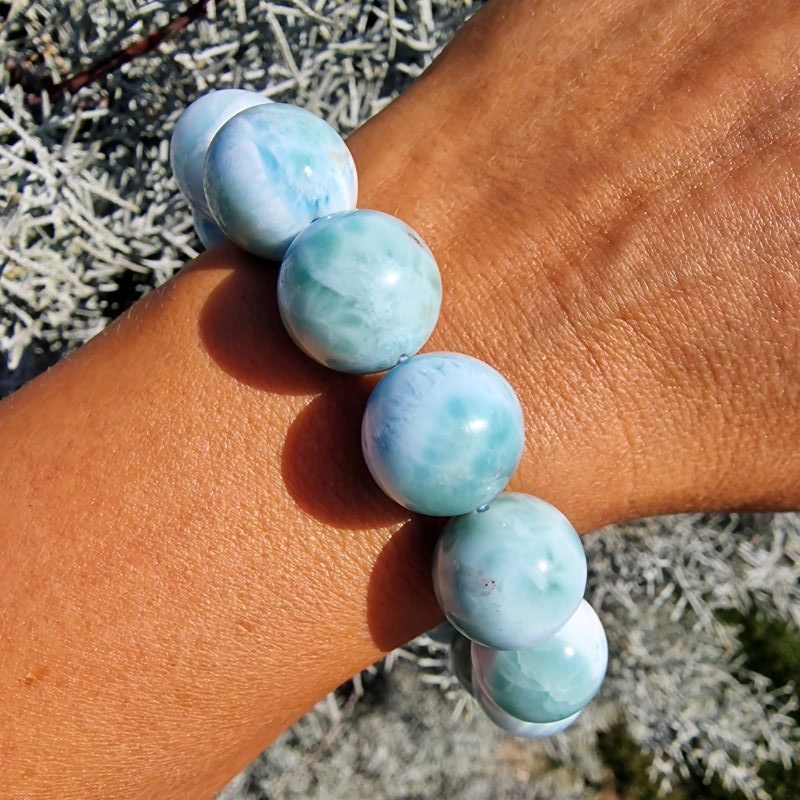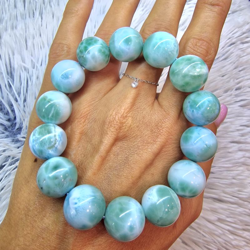 Ez a 16,5 -17 mm-es larimar ásvány karkötő valódi különlegesség az ásványékszerek világában. A nagy méretű, gondosan csiszolt larimar gyöngyök azonnal magukra vonják a tekintetet jellegzetes világoskék–türkiz színükkel és felhős, hullámszerű mintázatukkal. Egy erőteljes, mégis harmonikus megjelenésű karkötő, amely egyszerre luxus hatású és természetesen elegáns.