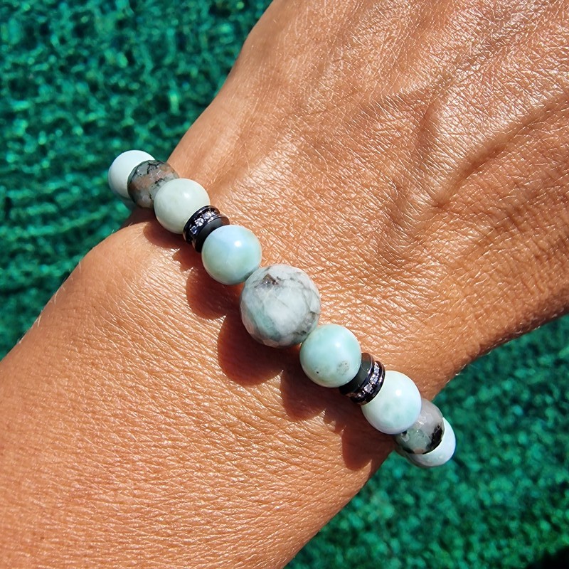 AB larimar ásvány karkötő, 3 d smaragd ásvány díszítéssel, 7-10 mm-es golyóméretekkel. Ritka zöldes színű.