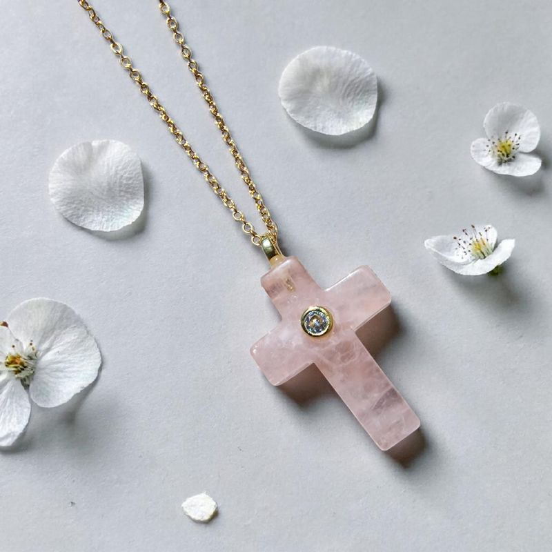 Rózsakvarc ásvány kereszt nyaklánc, cirkon díszítéssel