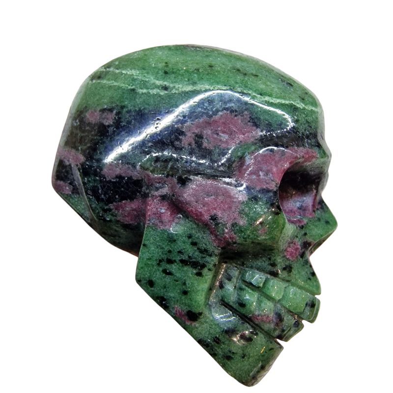 Az ásványból faragott koponya az újjászületés, tudás és védelem szimbóluma. A rubin-zoizit változat különösen erős transzformáló energiával bír – segíti a régi minták elengedését, és új, pozitív irányba tereli az életedet.