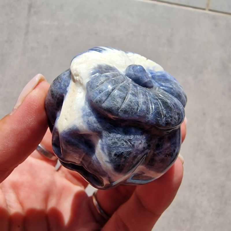 Ez a különleges, kézzel faragott szodalit ásvány tök a harmónia, belső béke és önkifejezés szimbóluma. A mélykék és fehér erezetű szodalit nyugodt energiát áraszt, segíti a koncentrációt és a tiszta gondolkodást, így ideális választás mindennapi inspirációnak vagy őszi dekorációnak.