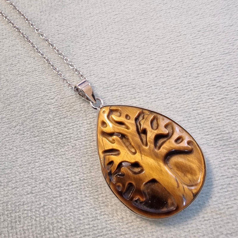 Vidd magaddal az erő, a védelem és a magabiztosság energiáját ezzel a tigrisszemből készült, életfa mintás medálos nyaklánccal! A tigrisszem meleg, aranybarna árnyalatai a bátorságot, az összpontosítást és a stabilitást erősítik – tökéletes kiegészítő a kihívásokkal teli napokra.