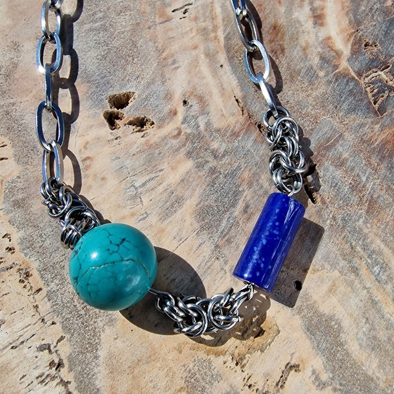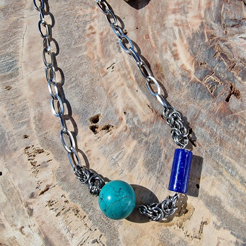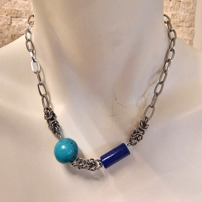 Valódi türkiz és lapis lazuli ásvány díszítésű nemesacél nyaklánc.