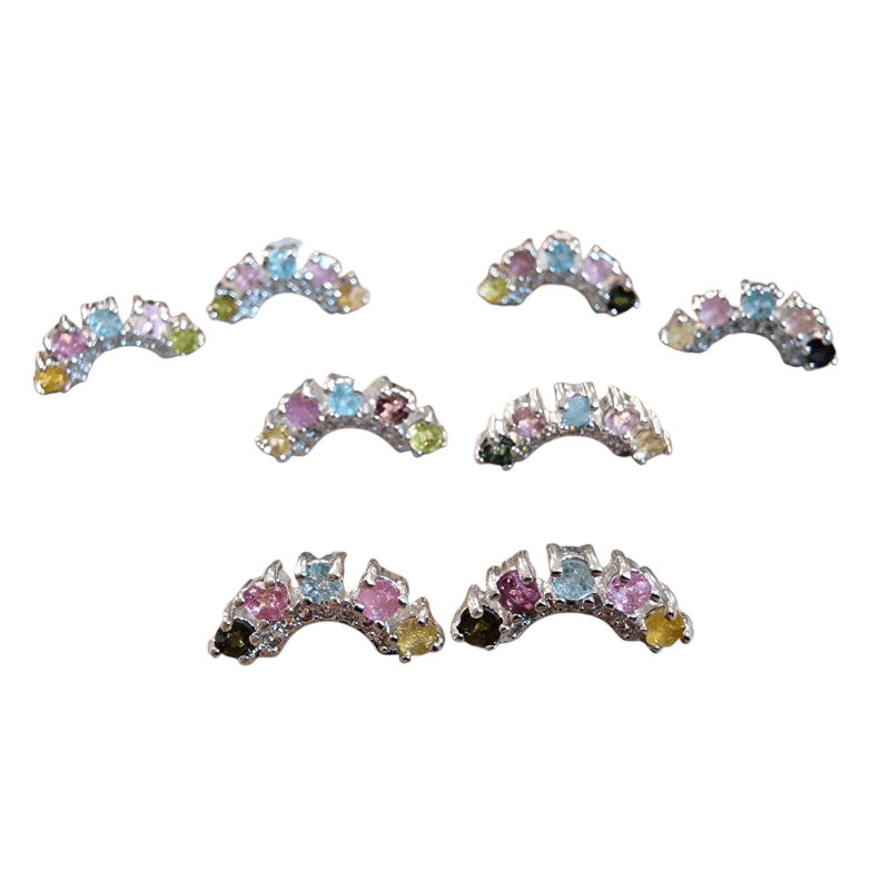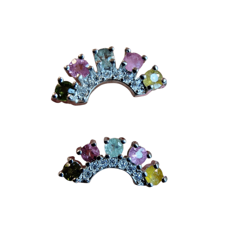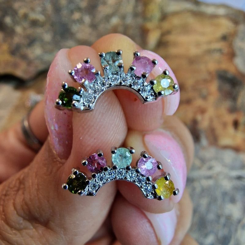 Ez a különleges turmalin ásvány fülbevaló igazi színkavalkád a mindennapokra és az alkalmi megjelenéshez is. A szivárvány formába rendezett, fazettált csiszolású turmalin kövek színes árnyalatokban csillognak, így minden fényben más arcukat mutatják.