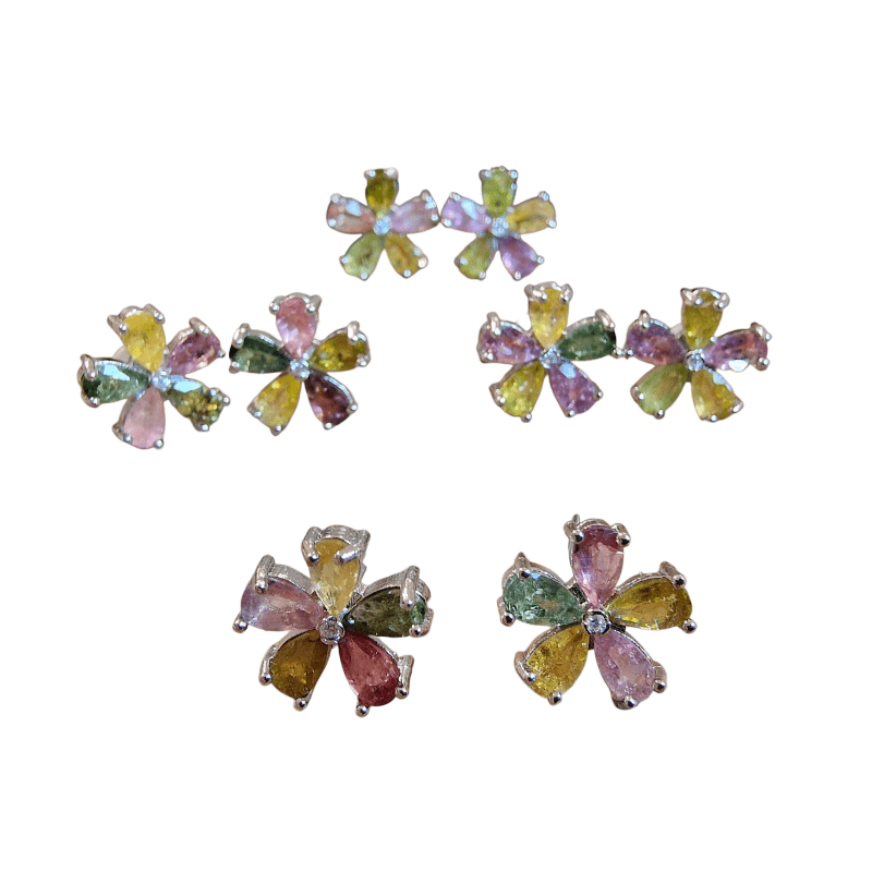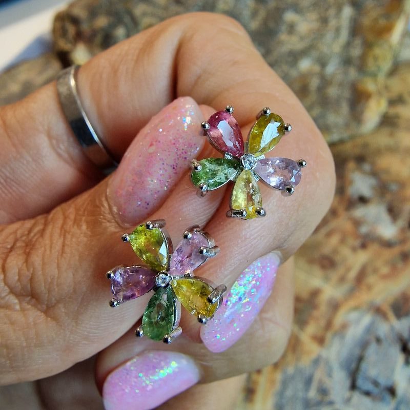 Ez a különleges turmalin ásvány fülbevaló igazi színkavalkád a mindennapokra és az alkalmi megjelenéshez is. A virág formába rendezett, fazettált csiszolású turmalin kövek rózsaszín, zöld, sárga és lila árnyalatokban csillognak, így minden fényben más arcukat mutatják.