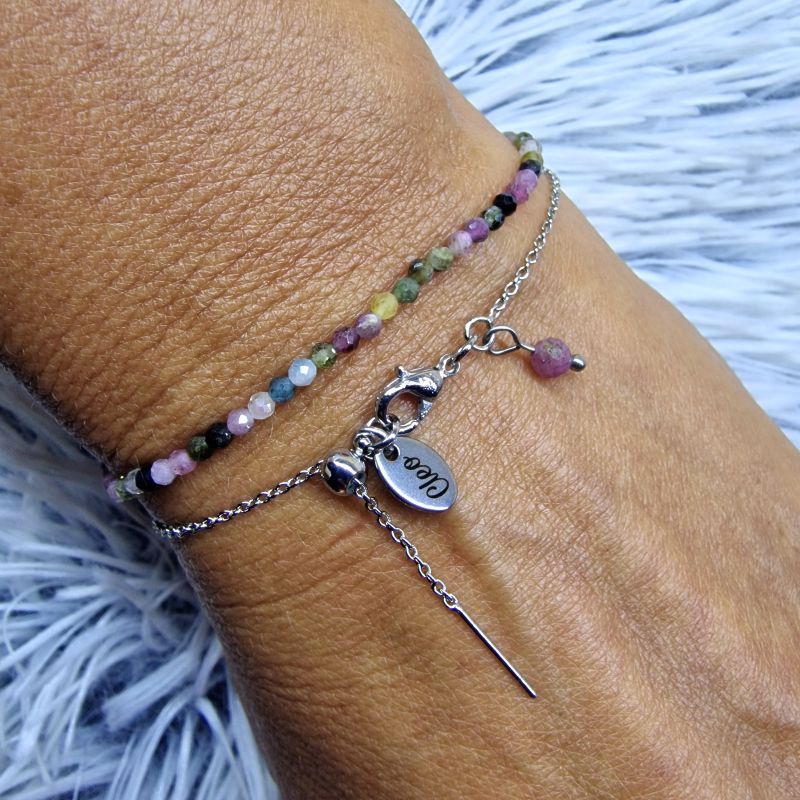 🔹 Ezüst színű nemesacél karkötő – finom láncszemekből áll, egy apró turmalin színű ásványgolyóval és Cleo lógóval díszítve. A lánc nemesacél tartós, allergiamentes és rozsdamentes.